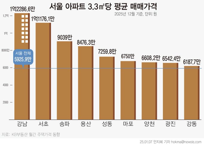 7일 KB부동산 월간 주택가격 동향 시계열 자료에 따르면 서울 아파트 3.3㎡당 평균 매매가격은 2024년 12월 5001.6만원에서 2025년 12월 5925.9만원으로 상승했다.