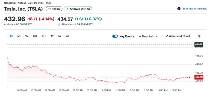 6일(현지 시각) 뉴욕증시에서 테슬라는 4.14% 급락한 432.96달러를 기록했다. 이로써 시총도 1조4400억달러로 줄었다.