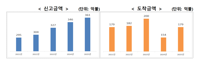 서비스업은 190억5000만 달러로 전년 대비 6.8% 증가했다. AI 데이터센터 및 온라인 플랫폼 등 분야에서 투자가 확대되면서 유통(29억3000만 달러, 71.0%), 정보통신(23억4000만 달러, 9.2%), 연구개발·전문·과학기술(19억7000만 달러, 43.6%) 업종 위주로 증가했다.