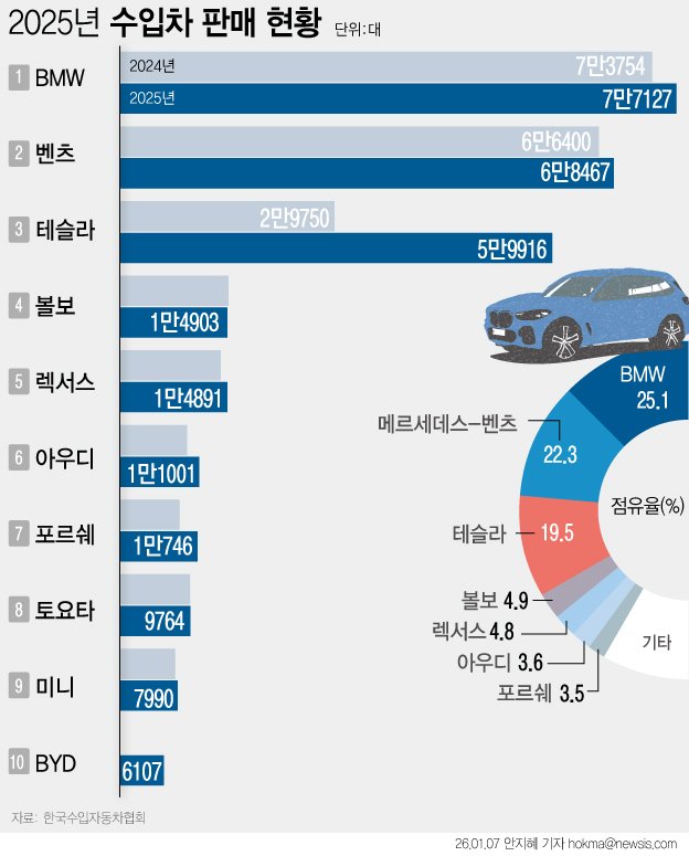 7일 한국수입차협회에 따르면 BMW와 메르세데스-벤츠의 합산 점유율은 47.4%로 2021년 이후 처음으로 50% 선이 무너졌다. 테슬라가 19.5%로 성장하면서 사상 첫 수입차 30만대 시대의 수혜를 누렸다.