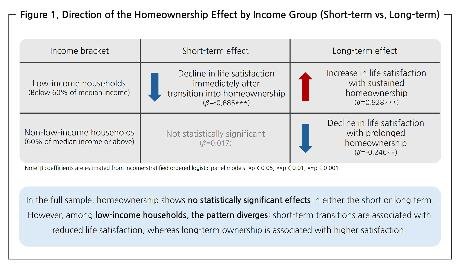 중·고소득 가구에서는 장기적인 자가 거주 상태 자체가 삶의 만족도와 오히려 부정적인 관계를 보이며, 주택 소유가 반드시 주관적 행복으로 이어지지 않는 양상이 확인됐다.