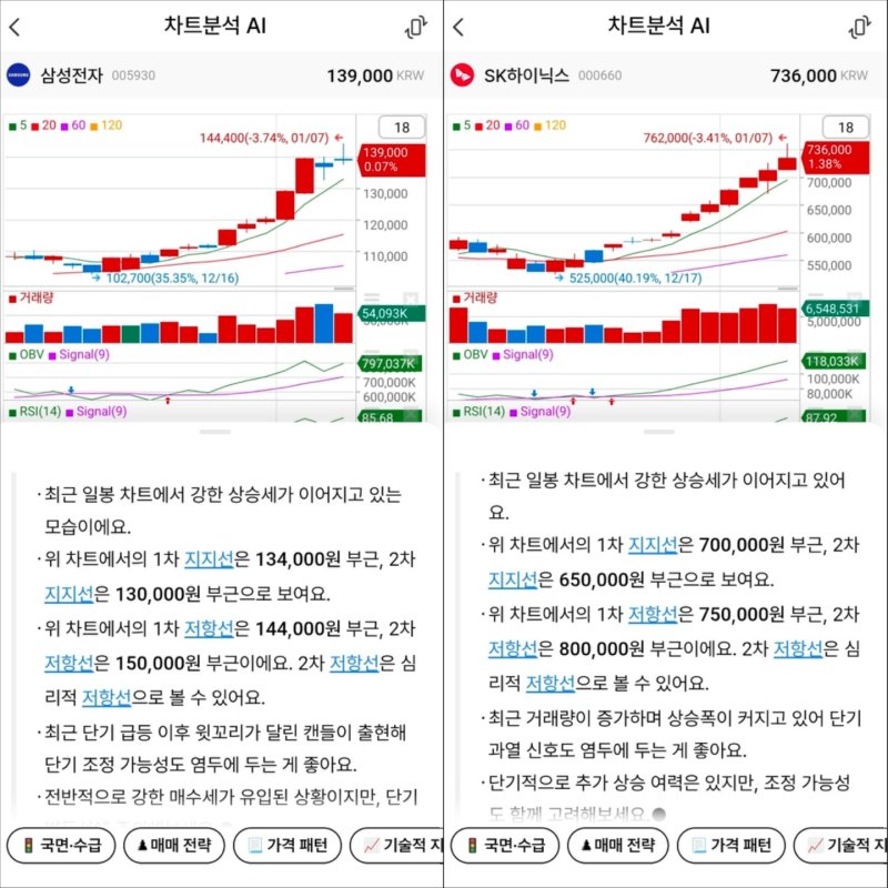 SK하이닉스는 강한 상승 모멘텀이 유지되고 있어 조정 시 매수 기회를 노려볼 것도 제안했다. 다만 SK하이닉스의 RSI 역시 과매수 구간인 87.9로 주의가 필요하다.