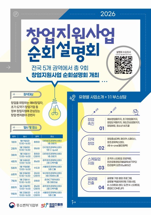 [서울=뉴시스] 권혁진 기자 = 창업진흥원은 한 달 동안 전국 5개 권역에서 창업자 대상 '2026년도 창업지원사업 순회설명회'를 개최한다고 7일 밝혔다.