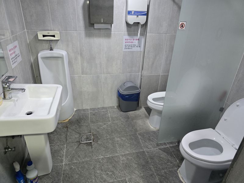 A씨가 제보한 사진을 보면 철문으로 된 화장실문을 열고 들어가면 왼쪽에는 세면대와 남성용 변기가, 오른쪽에는 양변기 2개가 놓인 모습이다.