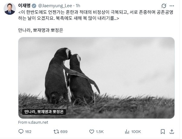 특히 이 대통령은 '만나라, 뽀재명과 뽀정은'이라는 제목의 기고 글을 함께 소개했는데, 남북 합작 애니메이션인 '뽀롱뽀롱 뽀로로'를 소재로 이 대통령과 김정은 북한 국무위원장의 만남이 성사되기를 기원하는 내용이다.