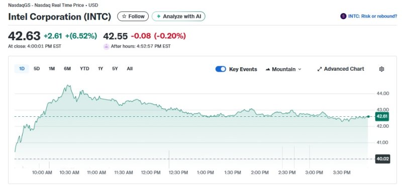 7일(현지 시각) 뉴욕증시에서 인텔은 6.52% 급등한 42.63달러를 기록했다. 이로써 시총도 2033억달러로 늘었다.