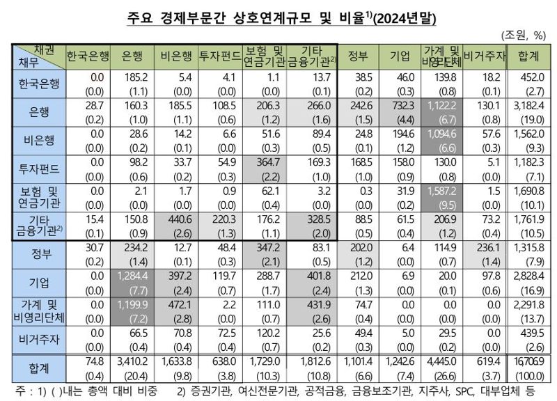 금융기관 간 상호연계성을 보면 그 규모는 3477조5000억원으로 전년 말(3191조9000억원)보다 285조6000억원 확대됐다. 상호연계는 은행(예수금, 발행채권), 투자펀드(펀드지분 설정액), 기타금융기관(예수금)을 중심으로 형성된다.