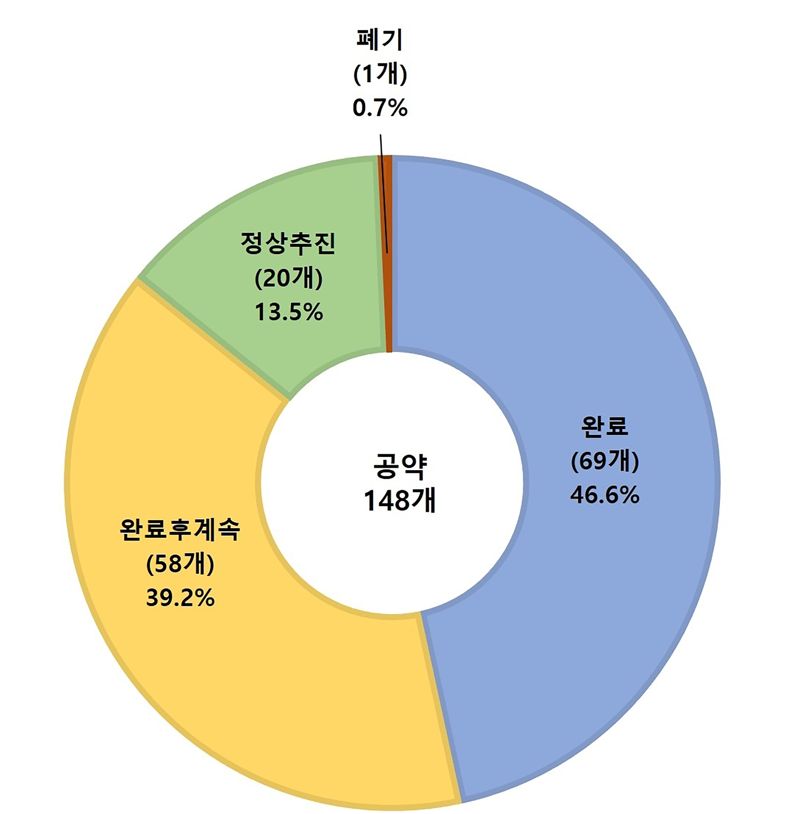 공약 완료율은 85.8%(127개)로, 공약 이행률 96.1%는 완료사업(69개·이행률 100%)과 완료 후 계속 추진(58개·이행률 100%), 정상 추진(20개) 중인 사업별 추진 정도를 백분율로 환산한 평균값이다.