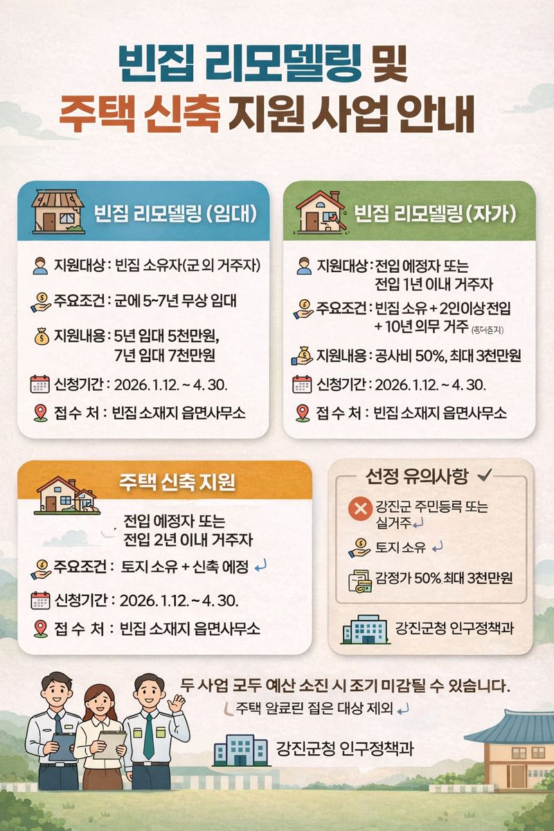 한편 두 사업 모두 예산 소진 시 조기 마감될 수 있으며, 세부 요건 충족 여부에 따라 대상자 선정이 제한될 수 있다. 자세한 내용은 강진군청 인구정책과 주거지원팀 또는 각 읍·면사무소로 문의하면 된다.