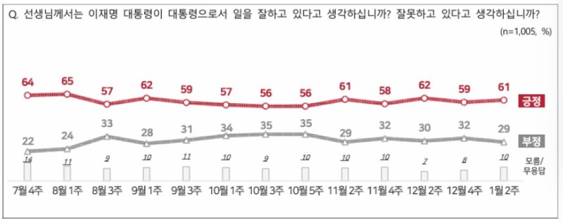 2주 전 조사(12월 넷째 주)에 비해 이 대통령 국정수행 긍정 응답률은 2%포인트 상승(59%→61%), 부정 응답률은 3%포인트 하락(32%→29%)했다.