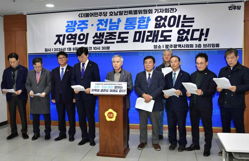 더불어민주당 호남발전특별위원회 광주·전남 위원들은 8일 광주시의회 브리핑룸에서 공동 기자회견을 열고 광주·전남 행정통합의 조속한 추진을 촉구했다.