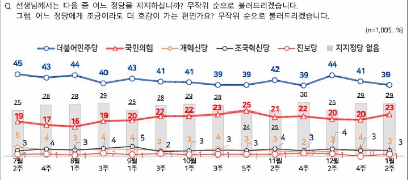 엠브레인퍼블릭·케이스탯리서치·코리아리서치·한국리서치가 지난 5~7일(1월2주차) 사흘간 만 18세 이상 남녀 1005명을 대상으로 진행한 NBS(전국지표조사)에서 정당 지지도는 민주당 39%, 국민의힘 23%로 집계됐다.