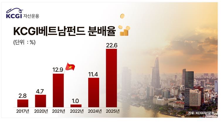[파이낸셜뉴스] KCGI자산운용이 운용중인 KCGI베트남펀드(주식혼합)가 지난 한해 23.0%의 수익률로 22.6%의 현금분배금을 지급했다고 8일 밝혔다. KCGI베트남펀드의 연 수익률 23.0%는 국내에서 운용 중인 설정액 500억원이상의 베트남펀드 중 2위에 해당하는 것이다. (출처: KG제로인 2025.12.31기준)