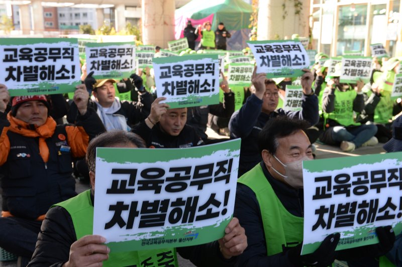 [울산=뉴시스] 구미현 기자 = 전국민주노동조합총연맹(민주노총_ 전국교육공무직본부 울산지부는 8일 "명절 휴가비를 정액제가 아닌 정률제로 적용하라"고 촉구했다.