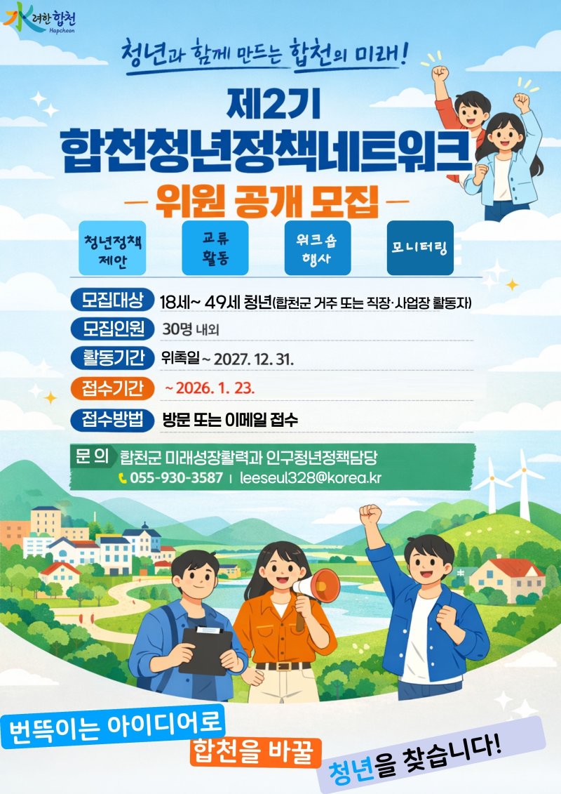 [합천=뉴시스] 서희원 기자 = 경남 합천군은 청년들의 다양한 목소리를 군정에 반영하고 청년정책 추진을 위한 소통 창구를 강화하기 위해 제2기 ‘합천청년정책네트워크’ 위원을 오는 23일까지 공개 모집한다고 8일 밝혔다.