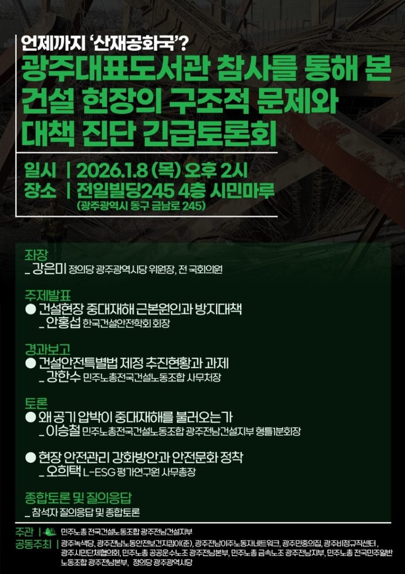 민주노총 전국건설노동조합 광주전남건설지부는 8일 광주 동구 전일빌딩245에서 '광주대표도서관 참사를 통해 본 건설 현장의 구조적 문제와 대책 진단 긴급 토론회'를 개최했다.