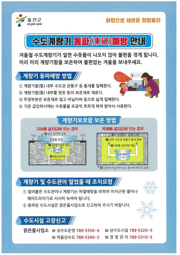 수도계량기 또는 수도관 동파 등 급수시설에 문제가 발생했을 경우에는 울진군 맑은물사업소로 신고하면 신속한 조치를 받을 수 있다.