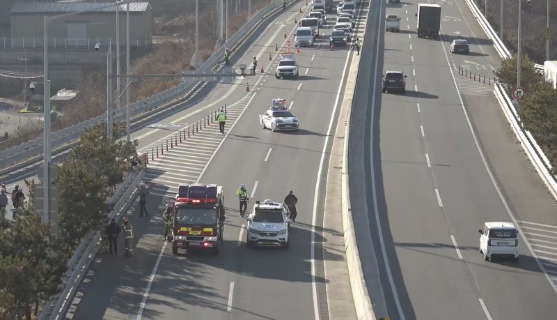 고속도로순찰대와 경찰서 교통경찰관과 함께 이뤄진 훈련은 고속도로 및 국도에서 교통사고 발생 시 △트래픽 브레이크(경찰차가 지그재그로 주행하며 서행유도)를 활용한 신속한 현장 통제 △차로 차단 및 우회 유도 △불꽃신호기·LED 안전경고등 설치 △도로관리청·소방 등으로 전개됐다.