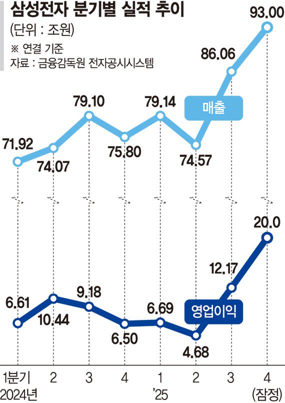 삼성전자는 지난해 4·4분기 매출 93조원, 영업이익 20조원을 기록한 것으로 잠정 집계됐다고 8일 공시했다. 전년 동기와 비교해 매출은 22.7%, 영업이익은 208.1% 증가했다. 지난해 연간 영업이익이 43조5400억원으로 추정되는 점을 감안하면 4·4분기에만 영업이익 절반을 벌어들인 셈이다.