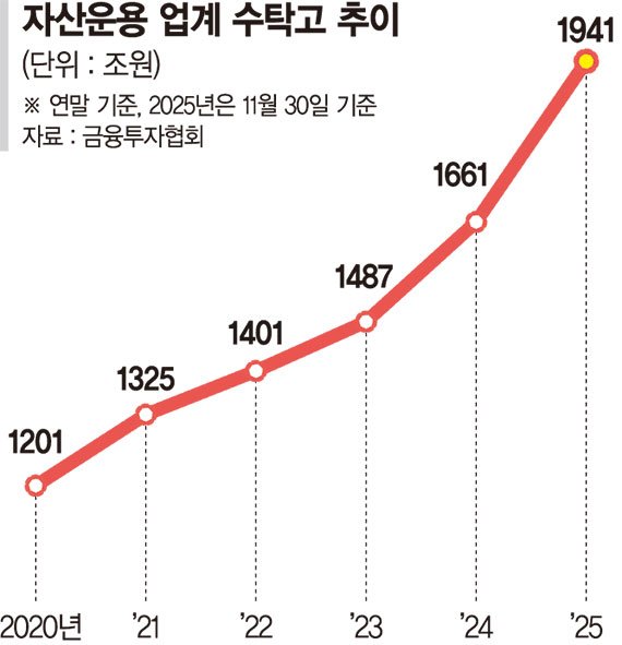 8일 금융투자협회에 따르면 지난 2025년 11월 말 기준 자산운용업계 수탁고는 1941조원으로 전년 말 대비 280조원(16.9%) 가량 증가하며 역대 최대치를 갈아치웠다. ETF 시장 성장세가 두드러졌고, 퇴직연금과 사모재간접, 목표전환형, 인컴형 상품으로 자금 유입이 확산되면서 성장축이 다변화된 게 특징이다.