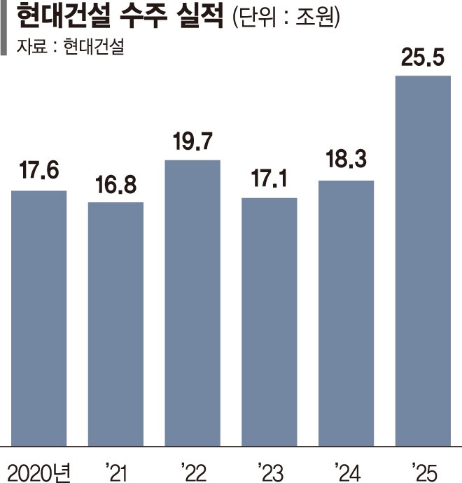현대건설은 2025년 연간 수주 실적이 25조5151억원(추정치)으로 집계됐다고 8일 밝혔다. 이는 전년 대비 39% 증가한 규모로, 국내 건설사 가운데 연간 수주액이 25조원을 넘은 것은 이번이 처음이다.