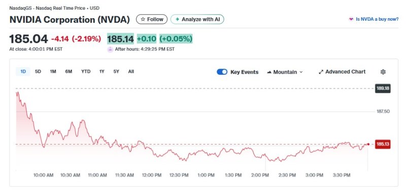 8일(현지 시각) 뉴욕증시에서 엔비디아는 2.19% 하락한 185.04달러를 기록했다. 이로써 시총도 4조5050억달러로 줄었다.