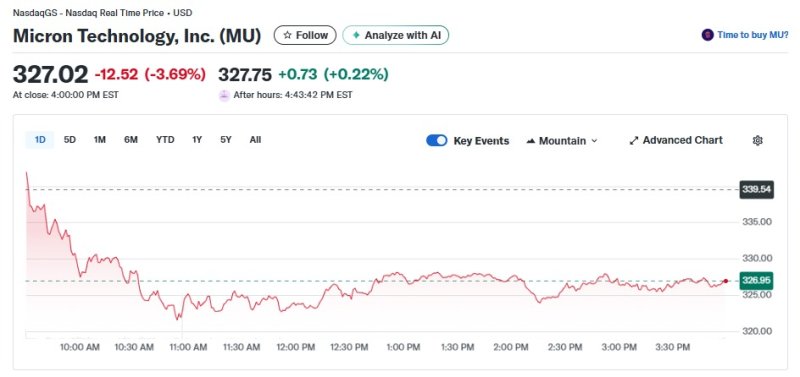8일(현지 시각) 뉴욕증시에서 마이크론은 3.69% 급락한 327.02달러를 기록했다. 이로써 시총도 3680억달러로 줄었다.