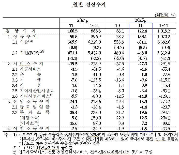 9일 한국은행에 따르면 2025년 11월 경상수지 잠정치는 122억1000만달러로 집계됐다. 이로써 31개월 연속 흑자 기록을 세웠다. 이는 2000년대 들어 두 번째로 긴 흑자 흐름이다. 앞서 2019년 3월까지 83개월 간 흑자가 이어진 바 있다.