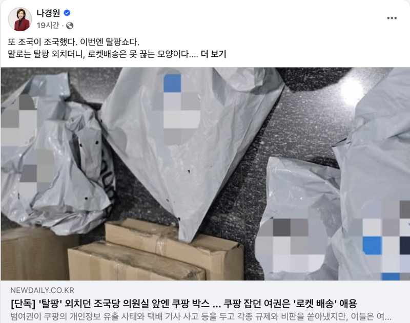 나 의원은 8일 조 대표가 쿠팡 이용 중단을 공개 선언했지만, 국회 의원회관 내 백선희 조국혁신당 의원실 앞에 쿠팡 배송 상자가 쌓여있다는 내용을 보도한 기사를 첨부하며 "또 조국이 조국했다. 이번엔 탈팡쇼"라고 꼬집었다.