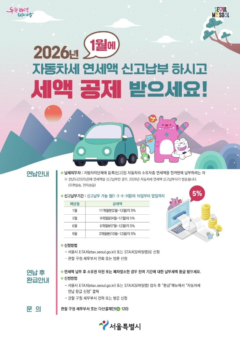 자동차세는 전용계좌 이체를 비롯해 서울시 ETAX 누리집, STAX 모바일 앱, 카카오페이·네이버페이·토스페이 등 간편결제 앱, ARS 등 다양한 방식으로 납부할 수 있다.