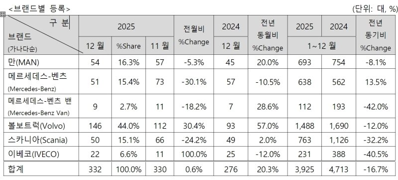 브랜드별로는 △만 54대 △메르세데스-벤츠 51대 △메르세데스-벤츠 밴 9대 △볼보트럭 146대 △스카니아 50대 △이베코 22대다.