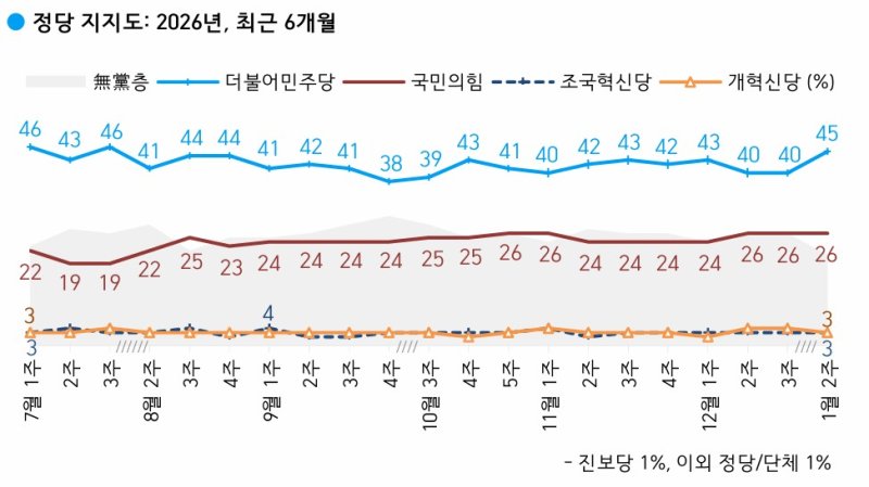 여론조사 전문회사 한국갤럽은 지난 6~8일(1월 둘째 주) 전국 만 18세 이상 유권자 1000명을 대상으로 정당 지지도를 조사한 결과 이같이 집계됐다고 밝혔다.