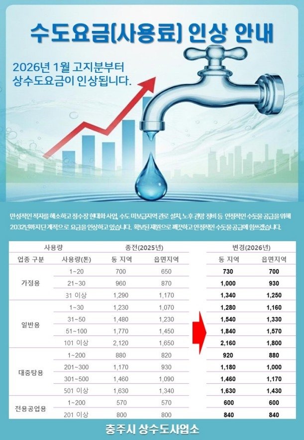 시 관계자는 "상수도 요금 조정은 노후 시설 개선과 안정적인 수돗물 공급을 위한 불가피한 조치"라며 "인상에 따라 사회적 배려계층을 위한 요금 감면 금액도 상향된다"고 말했다.