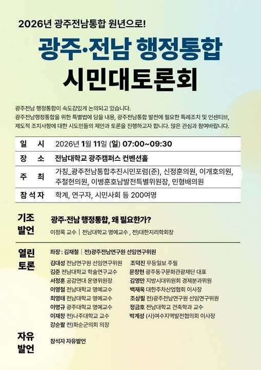 광주전남통합추진시민포럼(가칭)은 11일 오전 7시 전남대 컨벤션홀에서 '광주·전남 행정통합 시민대토론회'를 개최한다.
