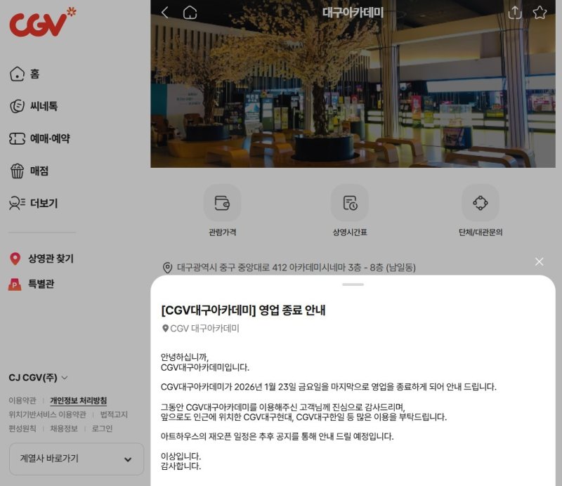 CGV대구아카데미 측은 9일 "그동안 이용해 준 고객들께 진심으로 감사드린다. 앞으로 인근에 있는 CGV대구현대, CGV대구한일 등을 이용해 달라"는 안내문을 홈페이지에 올렸다.