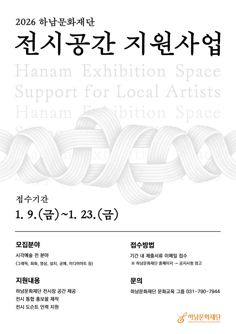 심사를 통해 선정된 작가에게는 하남문화재단 전시장 공간 제공과 함께 전시 통합 홍보물 제작, 전시 도슨트 인력 지원이 제공된다.