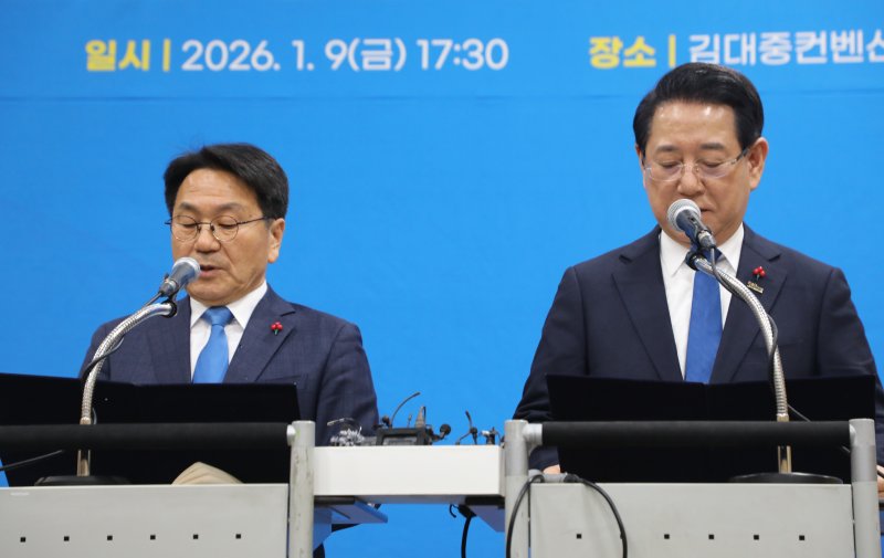강기정 광주시장과 김영록 전남지사가 9일 오후 광주·전남 행정통합 시도민 보고회를 진행하고 있다. 2026.1.9/뉴스1 ⓒ News1 이수민 기자