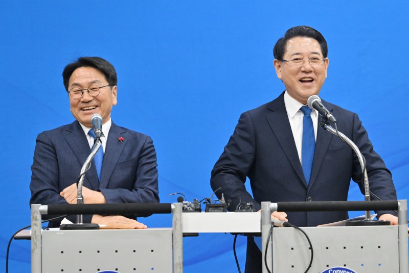 강기정 광주시장과 김영록 전남지사는 9일 오후 김대중컨벤션센터에서 광주·전남 행정통합 시도민 보고회를 열었다.