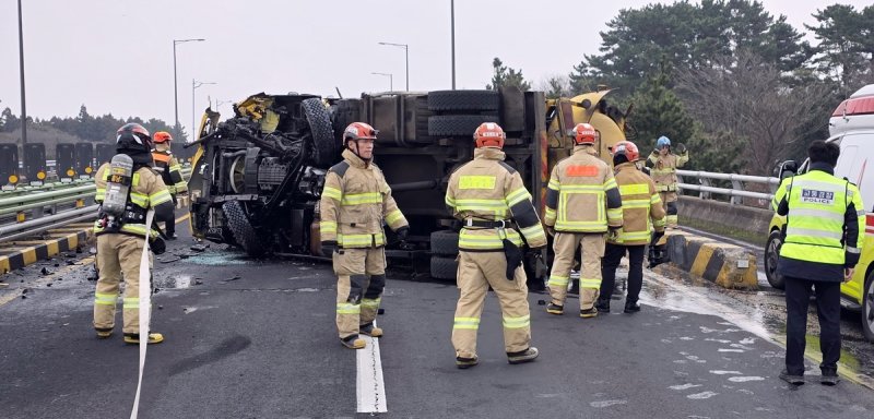 (제주=연합뉴스) 김호천 기자 = 10일 오전 10시 57분께 제주시 애월읍 제주운전면허시험장 인근 평화로에서 제주시 방향으로 운행 중이던 음식물쓰레기 운반차가 중앙분리대를 들이받고 전복됐다.