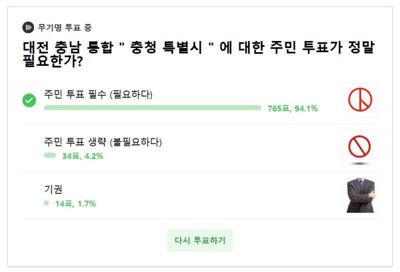주민투표에 대한 목소리도 커지고 있다. 최근 온라인 커뮤니티 '대전세종부동산풍향계'에선 '통합에 대한 주민투표가 필요한가'라는 투표가 진행되고 있다. 10일 오후 2시 기준 813명의 응답자 중 765명(94.1%)이 '주민투표가 필요하다'고 답했다.