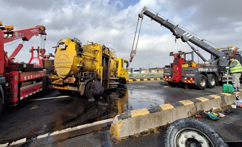 (제주=연합뉴스) 김호천 기자 = 10일 오전 10시 57분께 제주시 애월읍 제주운전면허시험장 인근 평화로에서 제주시 방향으로 운행 중이던 음식물쓰레기 운반차가 중앙분리대를 들이받고 전복됐다.