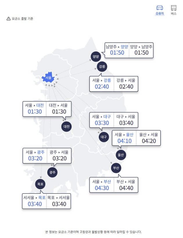 오전 10시 기준, 승용차로 운행할 경우 지방 도시에서 서울까지 걸리는 예상 시간은 △부산 4시간 40분 △울산 4시간 20분 △강릉 2시간 40분 △양양 1시간 50분(남양주 도착) △대전 1시간 30분 △광주 3시간 20분 △목포 3시간 40분(서서울 도착) △대구 3시간 40분이다.
