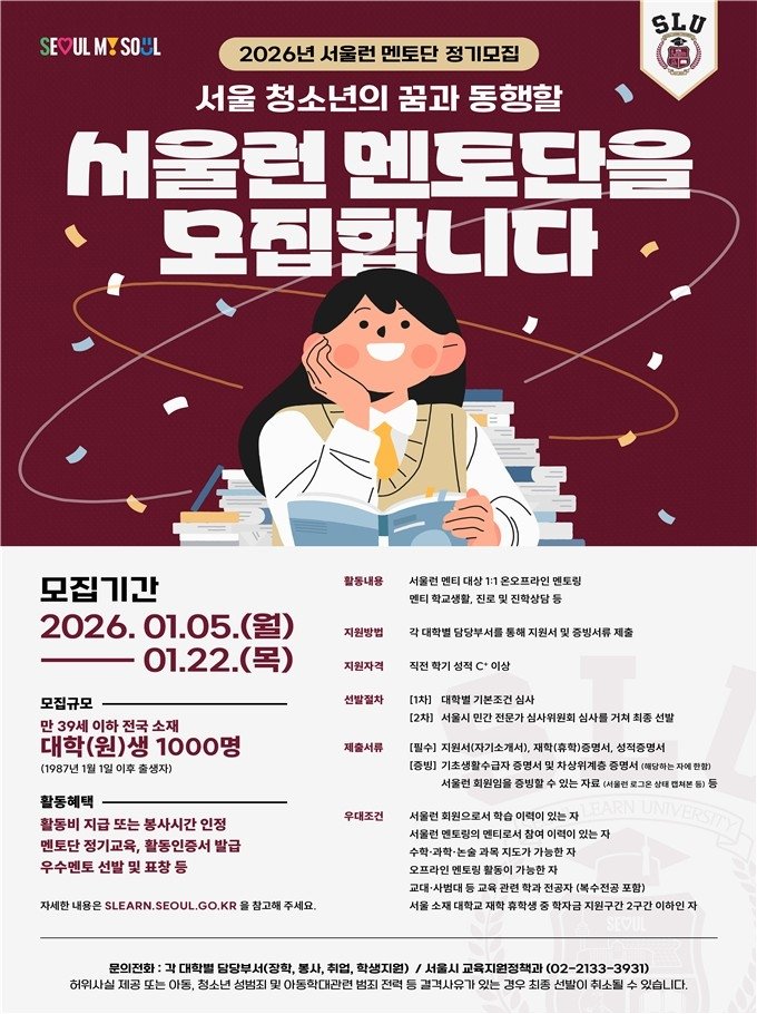 (서울=연합뉴스) 정수연 기자 = 서울시는 취약계층 청소년의 학습 메이트로 활동하는 '서울런 멘토단'에 새로 참여할 1천명을 오는 22일까지 모집한다고 11일 밝혔다.