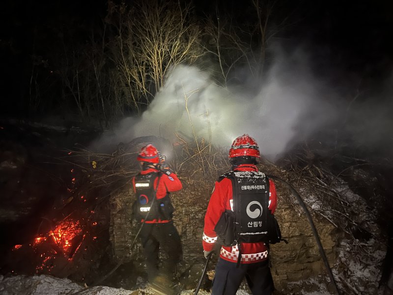 전날 일몰에 따라 산림청은 지방정부, 소방 등과 지상대원을 중심으로 밤새 잔불진화 작업을 벌였고 이틑날 일출과 동시에 진화헬기 10대를 총력 투입해 잔불정리를 완료했다.