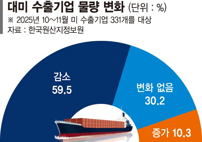 11일 업계에 따르면 최근 한국원산지정보원이 지난해 10~11월 미국 수출기업 331개를 대상으로 '미 관세 조치에 따른 수출기업 현황 조사'를 한 결과 미국향 수출물량이 전년 동기 대비 감소했다는 응답이 59.5%에 달한 것으로 나타났다. 수출이 20% 이상 감소한 기업도 18.4%로 집계돼 관세 부담이 단순한 비용 증가를 넘어 수출규모 자체를 위축시키고 있는 것으로 확인됐다.