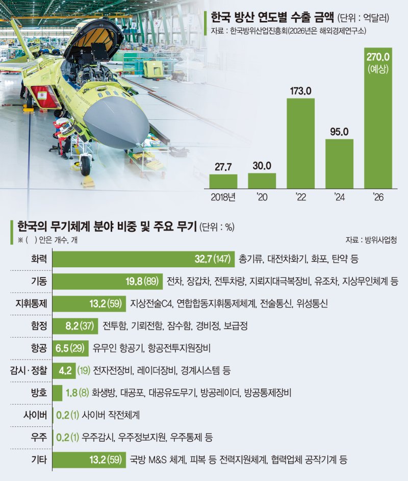 한국의 방산 수출액은 3년 전 우크라이나 전쟁 발발 시기에 급격히 상승했다. 문재인 정부에서 윤석열 정부로 정권이양 과도기였던 지난 2022년에 사상 최대 수출을 기록했다. 당시 러시아·우크라이나 전쟁 특수 효과였다. 폴란드에 K2·K9·FA-50 20조원 수출 성과 덕분에 나토 지역에 방산 수출은 미국에 이어 2위를 차지할 정도 큰 성과를 냈다. 하지만 윤석열 정부 첫해에 정점을 찍었던 방산 수출은 꾸준한 하락세를 보였다. 이재명 정부는 방산 수출 하락세를 줄이고 반등을 목표로 하고 있다. 중동 등지로 방산 수출 다변화를 통해 사상 최대 방산 수출을 목표로 하고 있다.
