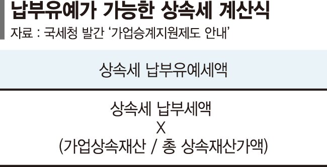 A씨의 경우 전체 상속재산에 대한 상속세 납부세액이 40억원이다. 총 상속재산가액이 100억원, 이중 가업상속재산이 90억원이라면 40억원의 90%인 36억원에 대해 납부유예가 가능한 것이다.