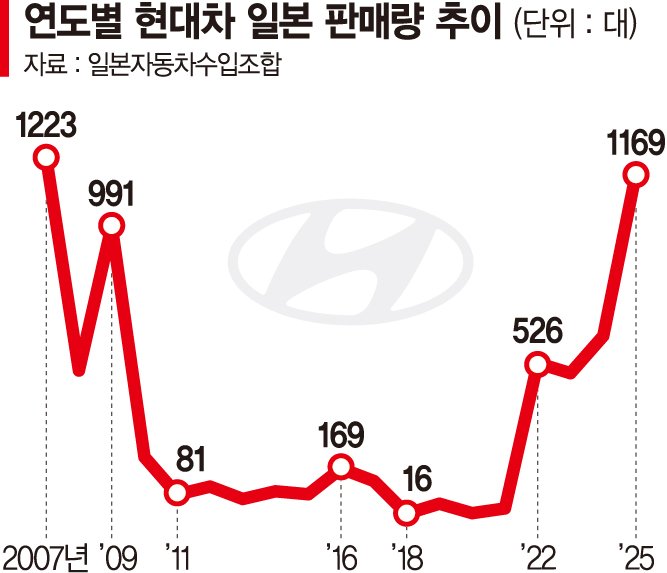 절대 수치는 작지만 지난 2024년 기준 일본 신규 차량 판매에서 자국 브랜드 비중이 95%가량임을 고려할 때 지난해 현대차의 판매량 상승세는 의미가 크다는 평가가 나온다. 도요타를 비롯한 자국 브랜드가 내수 시장을 장악하고 있는 일본은 해외 공장에서 생산해 일본으로 역수입되는 일본 브랜드의 차량도 연간 10만대를 상회할 만큼 자국 브랜드의 힘이 세다.