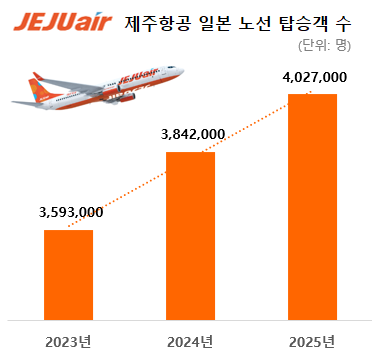 제주항공 관계자는 “엔저 기조와 근거리 여행 선호가 이어지는 가운데 공급 확대와 노선 경쟁력 강화를 통해 일본 노선 이용객이 역대 최대를 기록했다”며 “앞으로도 고객의 여행 트렌드에 맞춘 노선 운영과 차별화된 서비스로 일본 노선 경쟁력을 지속적으로 높여 나가겠다”고 말했다.