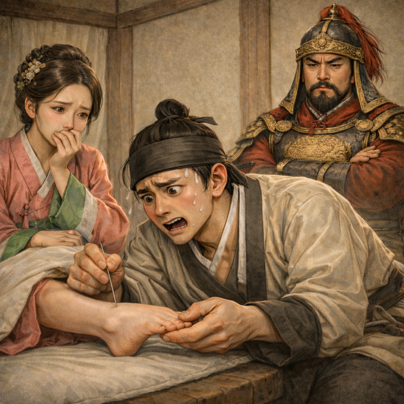 그런데 대장군의 첩이 침을 놓는다고 말에 두려워 떨기 시작했다. “제 증상이 사뭇 고통스럽게는 하나, 침은 무서워서 못 맞겠습니다. 대신 약을 처방해 주십시오.”라고 울먹이며 하소연을 했다. 그러나 제자는 스승에게 침만을 배웠기에 침 이외에는 약방문을 낼 실력이 없었다. 그래서 첩의 이야기를 무시한 채 침통에서 침을 하나 꺼냈다.